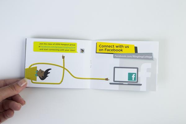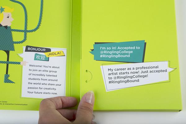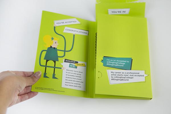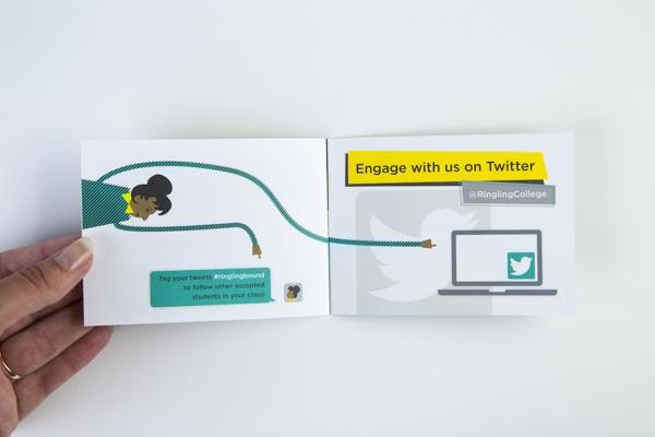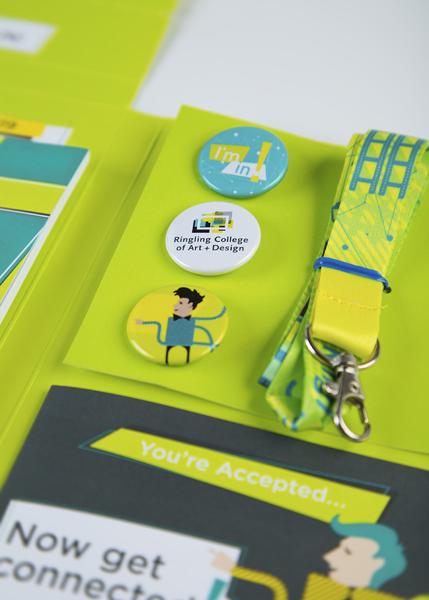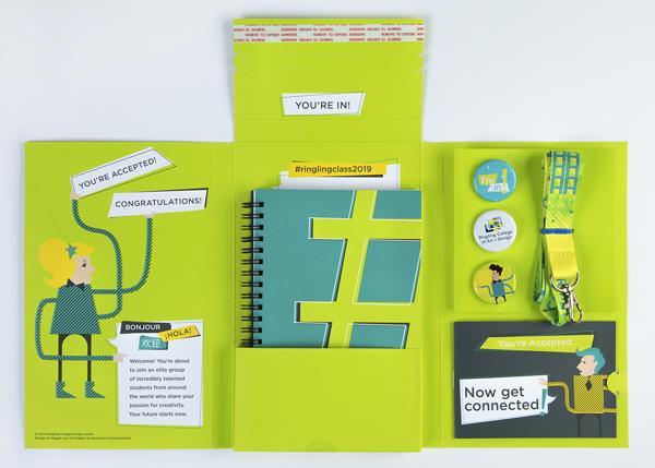 The concept of this package is to engage accepted students to share their acceptance via social media and connect with each other with hashtags such as #ringlingbound. The class of 2019’s package will be include the acceptance letter, a sketchbook, lanyard, booklet, and buttons. Instead of sending only a letter to accepted students, Ringling College sends an entire acceptance package to every student who is accepted.