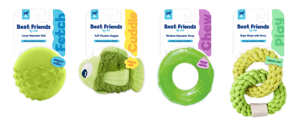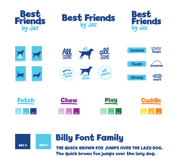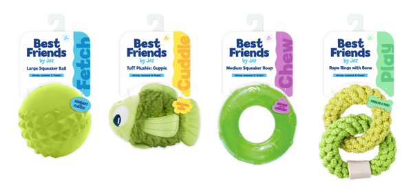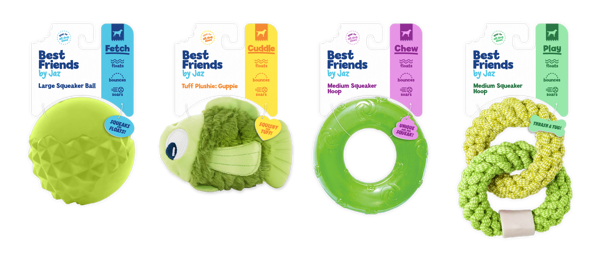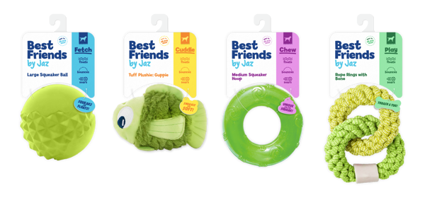 Branding and packaging for a pet toy brand Best Friends by Jaz. The name references what pets mean to humans’ loved companions & bffs. Jaz ties back to the parent company, Jazwares. The line is focused on four styles of play Cuddle, Chew, Play and Fetch. The packaging is sustainable, minimal and plastic-free, with a clean and simple aesthetic that directs focus to the toy. Color blocking is utilized to efficiently communicate the play pattern with a beautiful on-shelf presence.