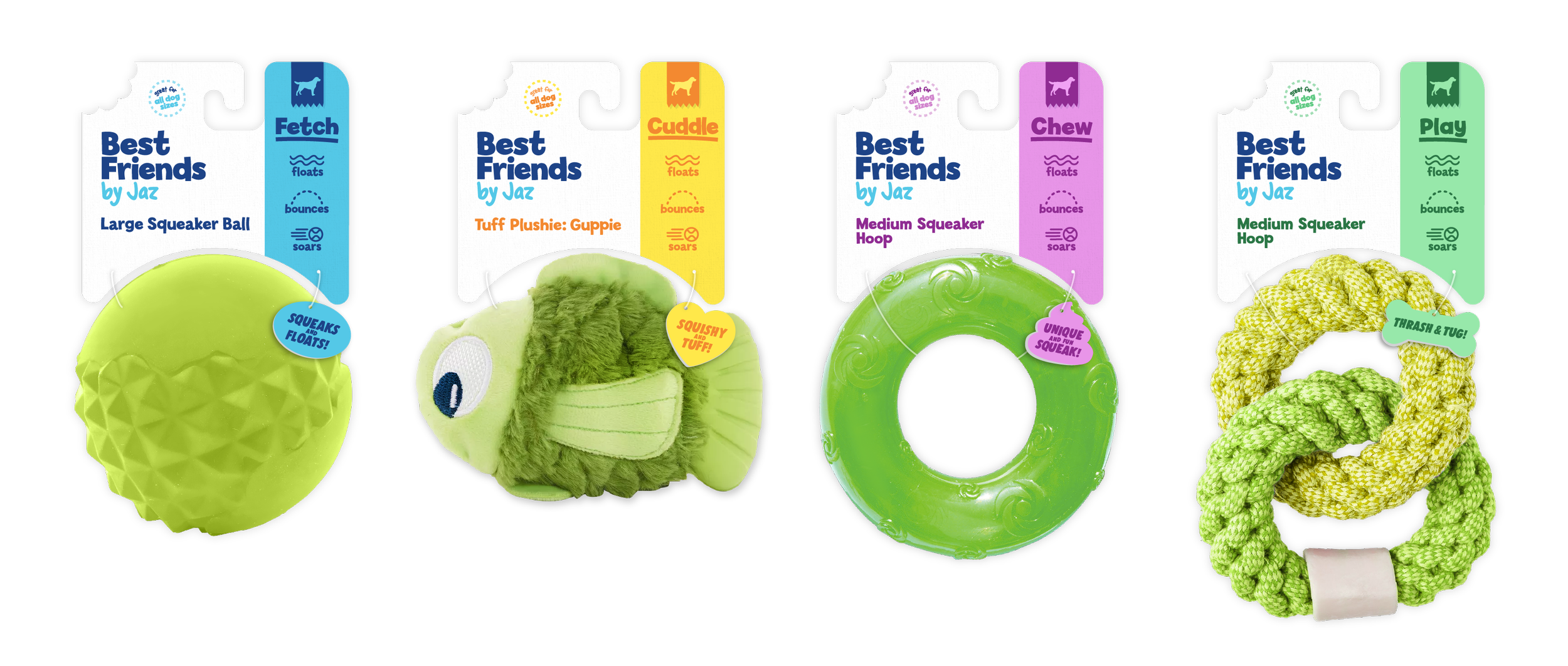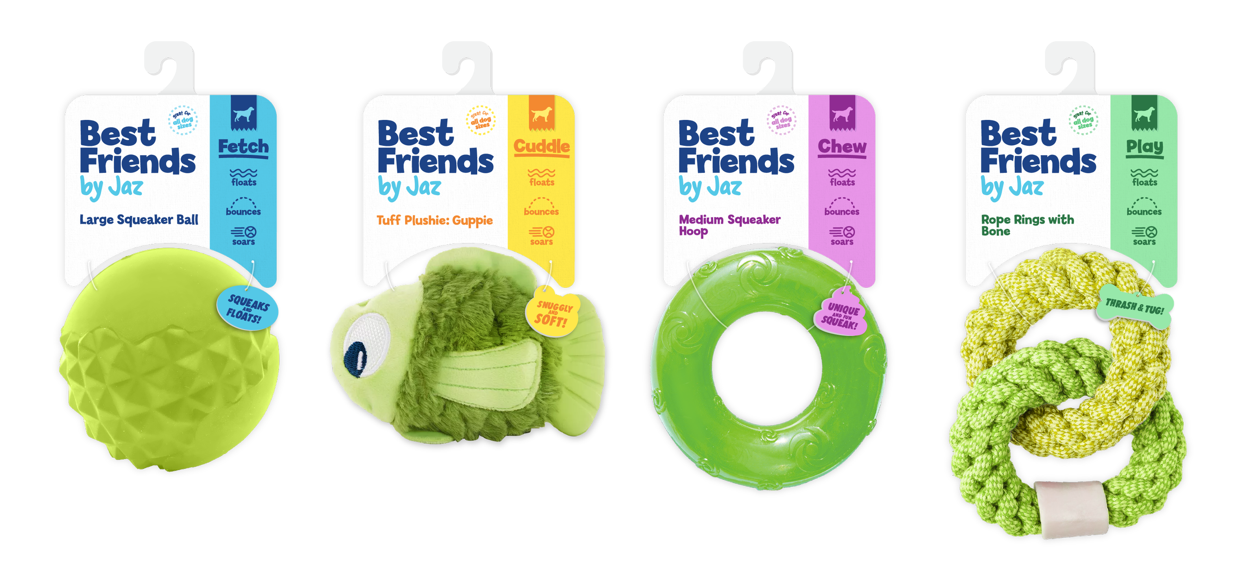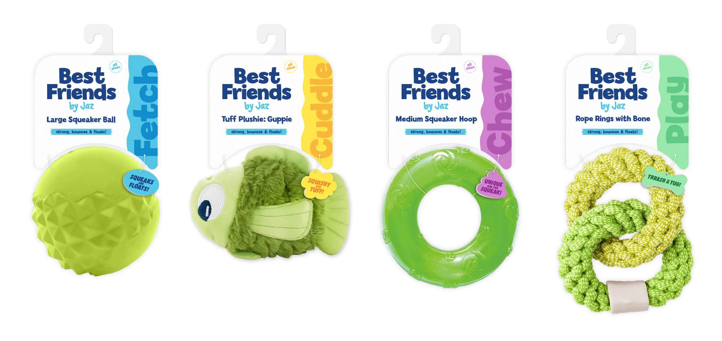 Branding and packaging for a pet toy brand Best Friends by Jaz. The name references what pets mean to humans’ loved companions & bffs. Jaz ties back to the parent company, Jazwares. The line is focused on four styles of play Cuddle, Chew, Play and Fetch. The packaging is sustainable, minimal and plastic-free, with a clean and simple aesthetic that directs focus to the toy. Color blocking is utilized to efficiently communicate the play pattern with a beautiful on-shelf presence.