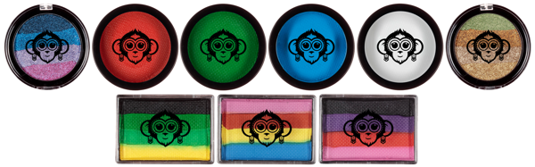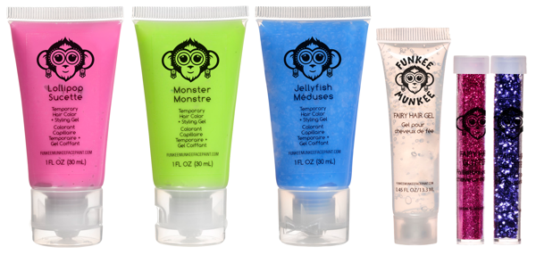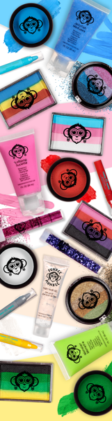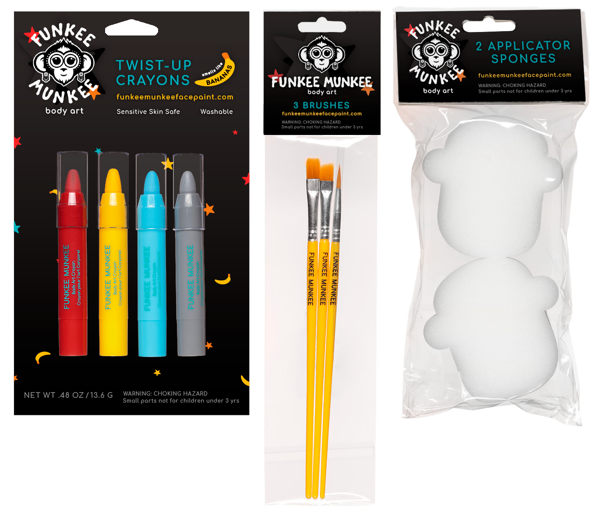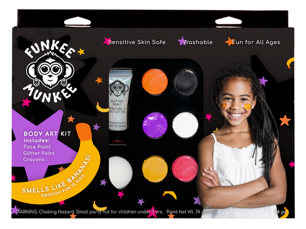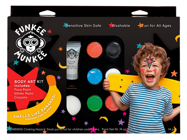 Branding and packaging concepts for Funkee Munkee—A body art brand targeting kids and millennial moms. The collection includes face paint cakes, temporary hair color, crayons, glitter kits and palettes.